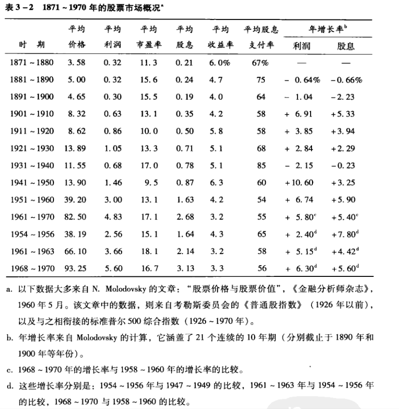 11. 為了對過去100年的股票經濟有全面的認識,除了股價走勢之外,還必須了解相應的獲利與股息情況。表3-2顯示的是1871~1970年的股市概況。