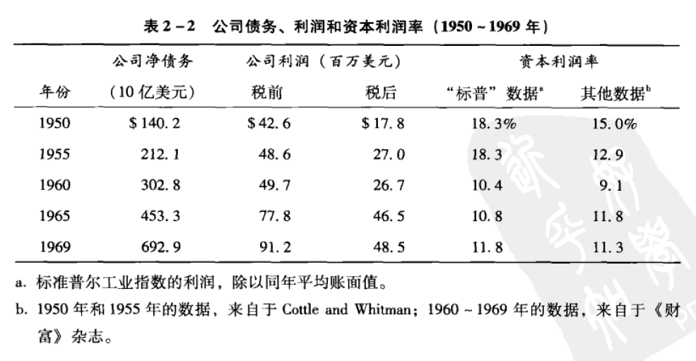 15. 不過,我們必須在此說明一下該表所未揭露的一個問題。1970年,美國企業的整體獲利出現了明顯的惡化,其投資資本獲利率下降到第二次世界大戰以來的最低水準。(Baron 補充: 1970年代石油危機爆發,CPI由6%一路上漲至12%,聯準會的連番升息以控制通膨,造成美國的停滯性通膨,GDP也出現了衰退。1980年代的第二次石油危機,雷根總統實施了較為強勢的美元政策,試圖壓制通膨高漲的情況,當時(1981年)的通膨率一度來到13.5%,在大幅調升聯邦基準利率至21.5%的史上高檔後,通膨隨即受到有效的抑制,但同樣的代價也是美國經濟再度出現衰退。在面對這兩次的經濟衰退時,聯準會的態度皆是以壓制通膨為主,儘管景氣出現了下滑,仍然調升目標聯邦基準利率水準,讓物價回到較穩定的水平。當時的聯準會主席分別為Arthur F. Burns以及Paul A. Volcker(前者為Alan Greenspan的老師)。 但這樣的高利政策也受到當時不小的質疑聲浪,包括需要大量資金借貸來作為周轉的產業,包括:營建業、農業,都受到很大的挑戰。美國失業率也一度來到10%的高檔。)